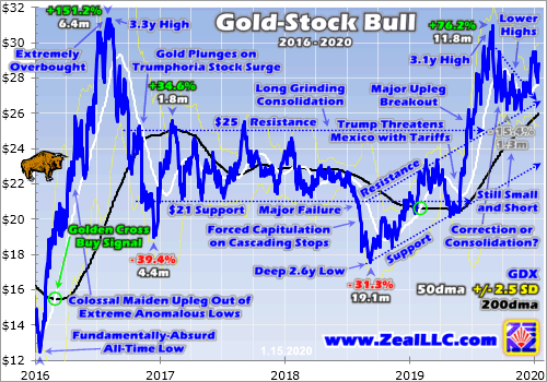 That fast run left them super-overbought, so a correction was highly probable to rebalance sentiment in this hot sector. And that indeed looked to be getting underway, with GDX retreating 15.4% over the next 1.3 months into mid-October. The gold stocks mostly bumped along those correction lows for another 1.3 months into late November. Then GDX rallied a bit, but kept grinding sideways on balance for most of December.