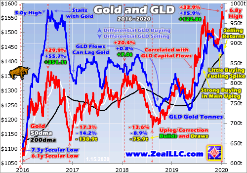 Gold investment capital flows tend to lag gold somewhat, as investors are slower to respond to gold price swings than speculators. GLD’s holdings peaked at 924.9 metric tons of gold held in trust for shareholders in late September a few weeks after gold’s last upleg originally crested. Then investors’ enthusiasm for gold faded with its price, so GLD’s holdings fell 4.8% or 44.3t into mid-December as GLD shares were sold.
