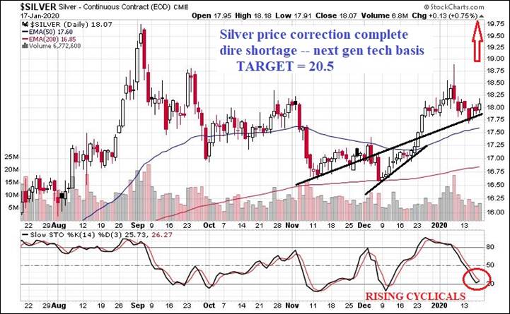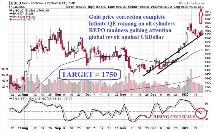 The Gold price is poised to move upward in an aggressive manner. Rising moving averages lead the way. The consolidation endured over September, October, and November has finished. The annual Christmas run-up was impressive from 1480 toward 1600, which also has endured its own consolidation. Fading REPO attention span, along with fading Iran War expectations can be attributed. The trendlines are upward. The cyclicals are positive. One must remember that with proper inflation adjustment, the $1300 price from year 2013 would be over $1900 today. Therefore, the current Gold price is absurdly under-valued. The next price target is 1750, on the march to reach the hallowed $2000 level.