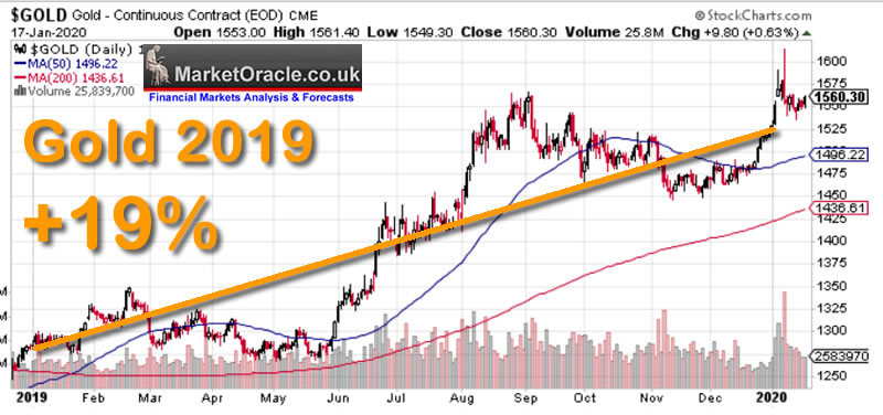 The gold bull market ended 2019 with a strong gain of 19%. The first half the year was marked with uncertainty as the price after an early year surge to $1350 gave up all of it's gains to drift lower to trade down on the year by early May. However, this was the calm before the bull market storm and that set the stage for a powerful bull run starting early June that saw the Gold price rocket higher to a early September peak of $1566, up over 25% on the year! Igniting Gold bug fever and encouraging prominent gold bugs to get carried away with headlines of Gold heading for $5000 and beyond.