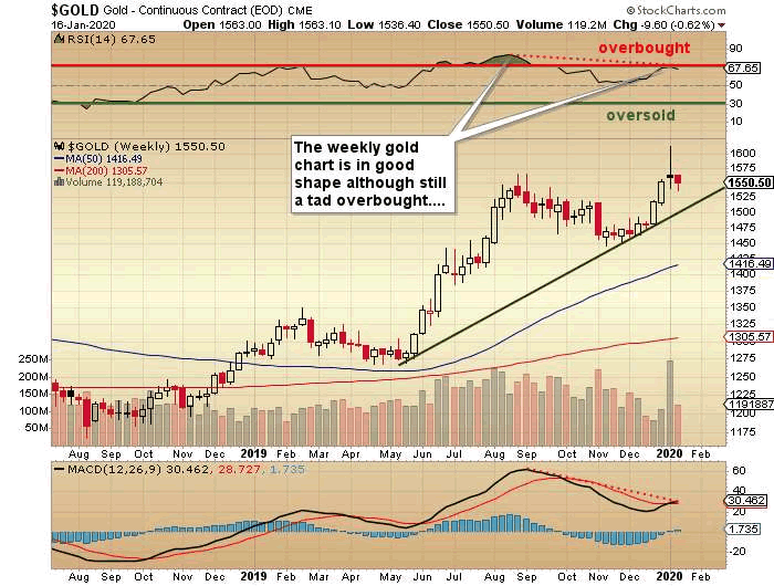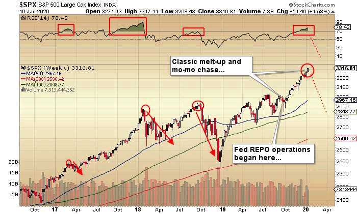 The S&P weekly chart goes back to 2017, and clearly shows a pattern of how corrections are born from elevated relative strength index (RSI) readings. I said that the gold chart looked "a tad overbought," but the S&P chart is more overbought than last summer, just before it took a Q4 20% haircut. . .until, of course, Smilin' Stevie Mnuchin mobilized the Plunge Protection Team (PPT) and saved Wall Street bonuses for 2019.