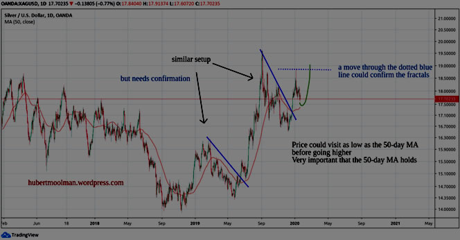 On the chart there appears to have formed some fractals. The current one has also broken out at the blue line in middle to late December of 2019, and is currently retracing.