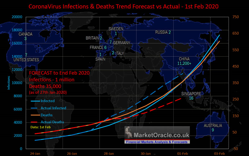 My analysis of 28th Jan concluded forecast expectations for the virus to spread exponentially first across China and then across the world to target 1 million infections by the end of February resulting in 35,000 deaths.
