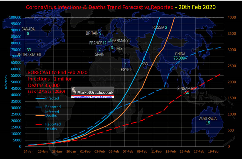We in the West are in still the CALM before the Coronavirus STORM stage, both in terms of infections and in terms of economic impact as we witness China's economy effectively grind to a halt, a harbinger of what to expect to come that the financial markets are STILL NOT discounting! For China's Coronavirus statistics grossly under report the number of infections by several multiples that this analysis will attempt to determine the true magnitude of China's outbreak which even the Chinese CDC now admits that their statistics are under reporting by significant degree the actual number of infected. Which has not just been my consistent view since the Coronavirus story first broke a month ago, but many scientists around the world have questioned China's data as measured across several metrics such as the unrealistic day to day change in infection numbers that for want of a better word were unnatural.