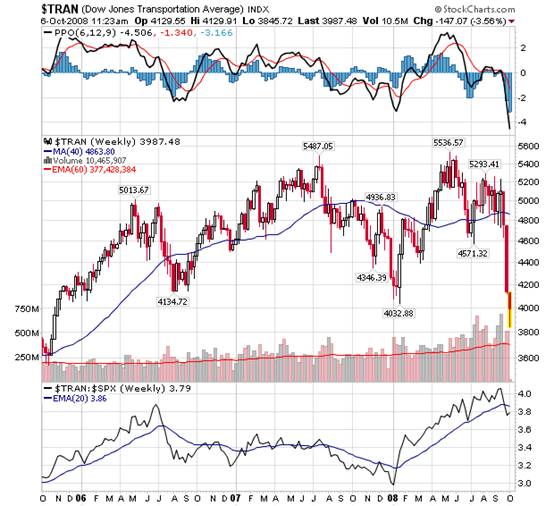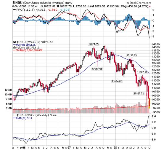The bear has returned with a vengeance. It looks like the Paulson bailout package was too little too late. The lines in all the major averages that were being drawn since June have now been crashed to the downside. Thus our decision to wait on the sideline last month has been vindicated. It was one of the worst stock market months in years and it is bound to get much uglier before a bottom is reached. Hopefully capitulation will come sooner rather than later.