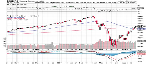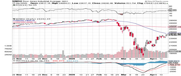 Given the prognosis going forward that we are in a recession and that for the next two to three quarters, at least, the world will experience negative GDP numbers it is unbelievable that the Dow Industrial Index is less than 20% down from its previous high. The reason for this is that the world's central banks have nationalized the markets and the American Congress has basically nationalized its economy. However, this cannot last forever; eventually economic reality will rear its ugly head. From a pure technical standpoint all indices have suffered great damage and it will be some time before they will be in a position to provide good trading guidance. Suffice to say, currently there is above average risk in all sectors. I anticipate recent March lows to be retested. If they hold it will be the start of the formation of a bottom but I do not expect that to happen. I expect the retest to fail. Once the world's economies open up from COVID-19 lockdown I anticipate ongoing volatility and market weakness as business failures, bankruptcies, receiverships and commercial and residential foreclosures cascade throughout nations as the harsh realities of mountainous debt and contracting GDP comes to bear.