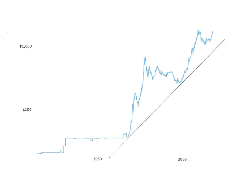 The angle of the uptrend is fairly steep, yet it is possible for the gold price to fall back to as low as $1000 per ounce without violating that long-term uptrend, which dates back to 1970.