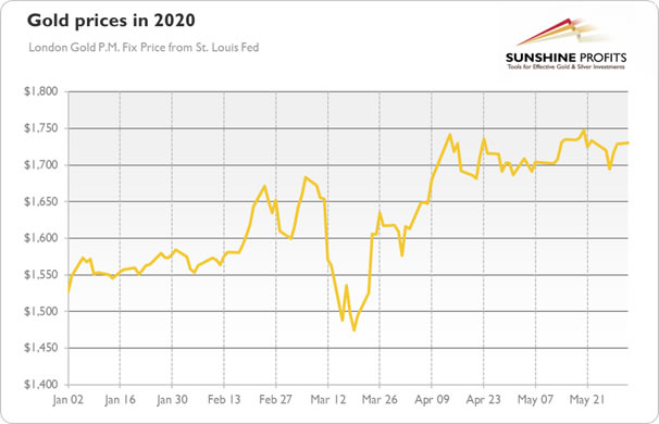 What do the riots across the US imply for the country and the gold market? Well, the civil unrest should be positive for the yellow metal. There are three reasons for this. The first and most obvious is that geopolitical risks concerning the US directly could spur the safe-haven demand for gold. We are, of course, fully aware that geopolitical factors rather do not drive the long-term trend in the gold prices, but they help in the short-term. As the chart below shows, the yellow metal has been consolidating recently around $1,700, perhaps preparing for further upward move.