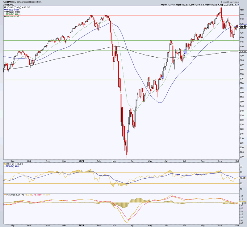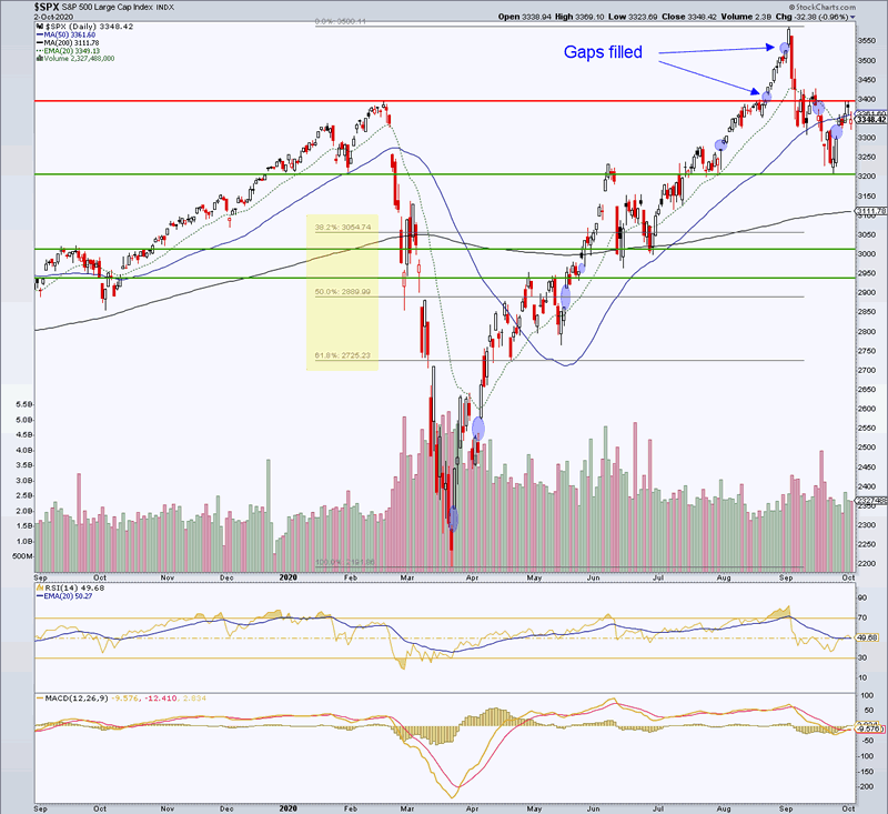 Moving on to the US stock market, the gap fest known as the daily S&P 500 (it’s companion headline indexes are gap infested as well) bounced this week, right to the lost ‘blue sky breakout’ point at 3400 and halted on a Friday featuring weaker than expected payrolls and a president infected with COVID-19. Usually inflammatory and negative market events out of the blue resolve bullish after a quick shakeout. But there are more elements in play than Trump’s health.