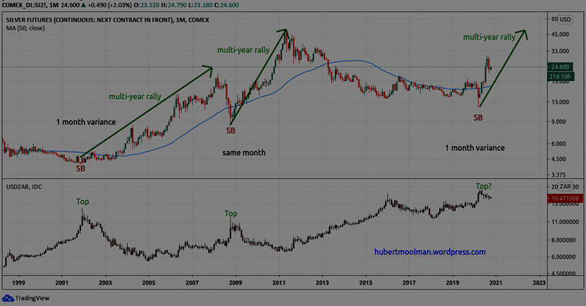 The 2001 silver bottom(SB) occurred one month before the key 2001 USD/ZAR bottom. This was followed by a multi-rear silver rally.