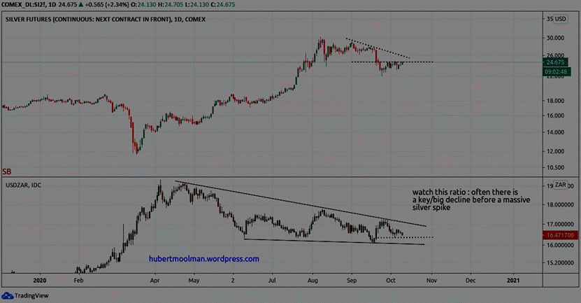 The USD/ZAR chart has been a good predictor for silver rallies. Similar to the US Dollar index, but a bit more accurate or precise. Very important silver bottoms tend to coincide with tops of the USD/ZAR chart.