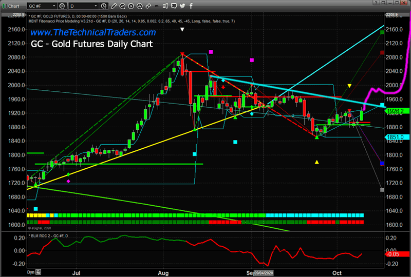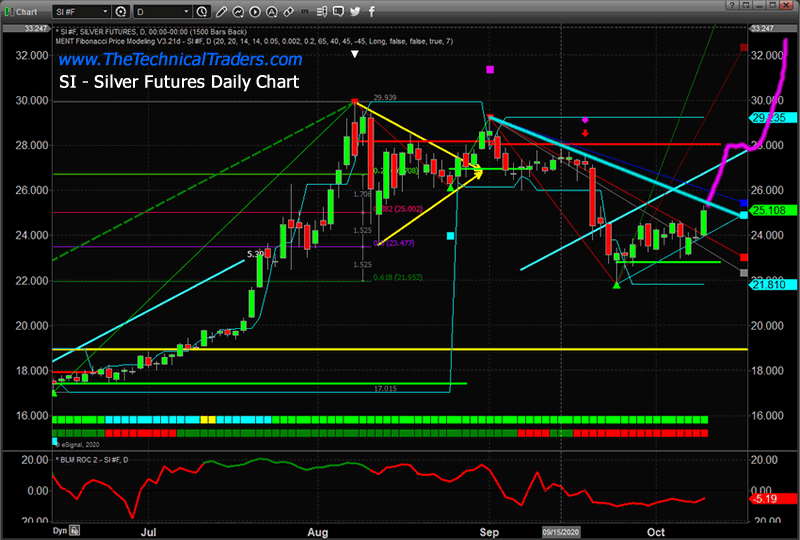 After nearly three weeks of sideways/downward price action in Gold and Silver, our researchers believe both metals have already set up another breakout/rally attempt after breaching downward resistance (shown as the downward sloping CYAN line). This could be another huge opportunity for precious metals traders as the next move higher should prompt a rally above recent highs. That means a target price level in Gold above $2100 and a target price level in Silver above $30.50.