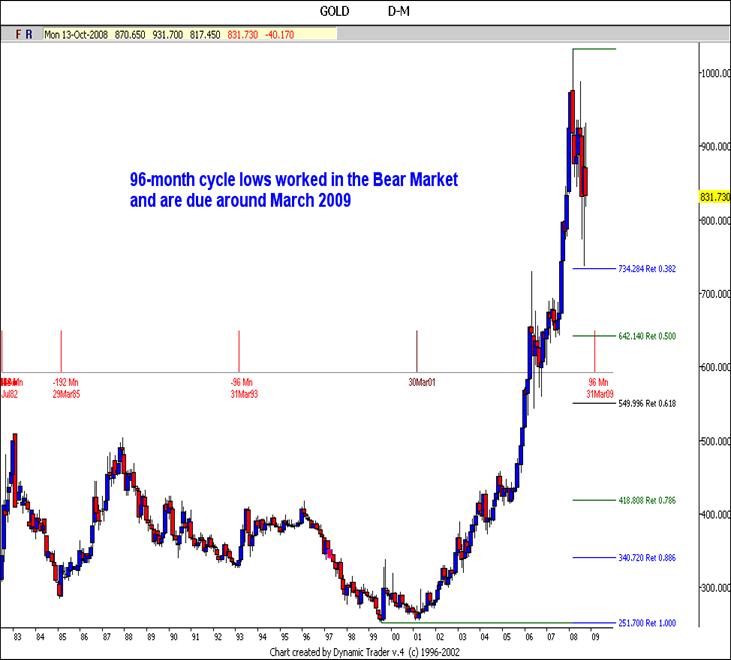 In returning to the big picture on gold, I am expecting the 96-month cycle low to reappear in March (see chart below) and this is likely to be the end of the C wave of the Major A, B, C correction from March 2008. It is likely to be fast and furious and take gold down to retest the lows or even down to the next level, the 50% retracement at $642.