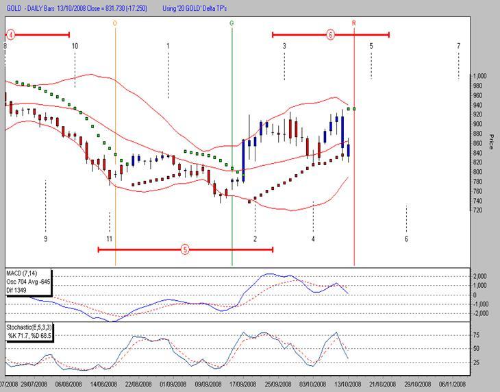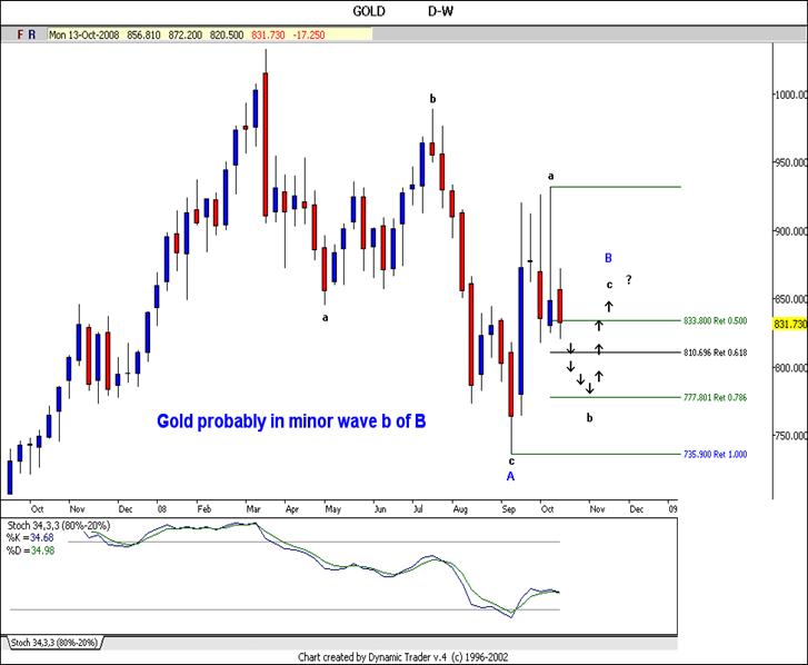 We completed the A wave down in the week ending 12 th September and the “a” Wave of B has taken 4 weeks. The “b” of b will probably take a similar time and bottom around $777. The Stochastic is rolling over showing weakness ahead, as is the MACD.