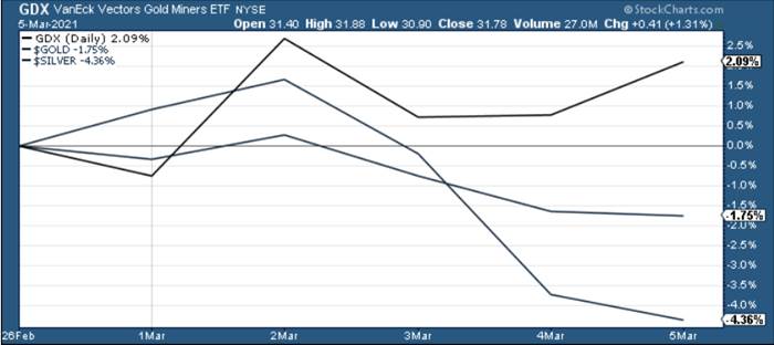 After closing only $0.10 below my initial downside target of $31 on Mar. 1 , the GDX ETF could be ripe for an upward revision. Able to ignore much of last week’s chaos, the GDX ETF’s outperformance of gold and silver signals that the tide has likely turned.