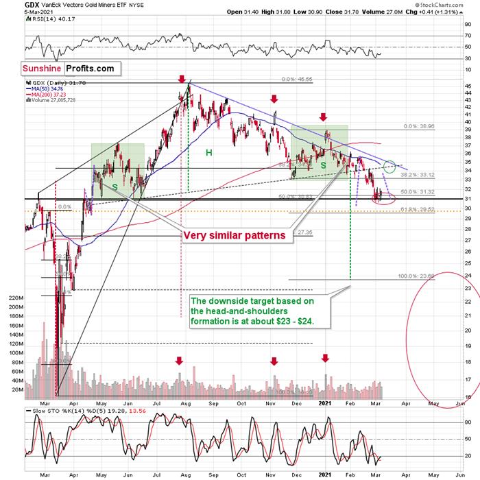Copying these price moves (purple lines) to the current situation, we get a scenario in which GDX (mining stocks) moves to about $31 and then comes back up to about $34. This would be in perfect tune with what I wrote previously. After breaking below the head-and-shoulders pattern, gold miners would then be likely to verify this breakdown by moving back up to the neck level of the pattern. Then, we would likely see another powerful slide – perhaps to at least $24.