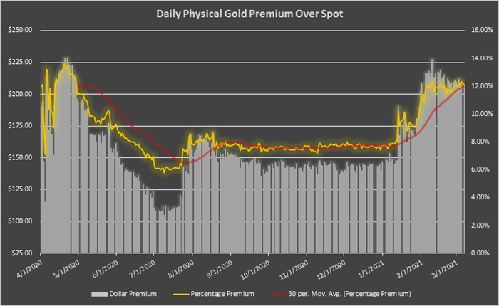 A: It’s a tough call, because the premium values don’t follow the technical patterns. Still, based on the analogy to situations that seem similar to what we saw recently, it seems that we can indeed say something about the likely physical values close to the likely $1,450 bottom.