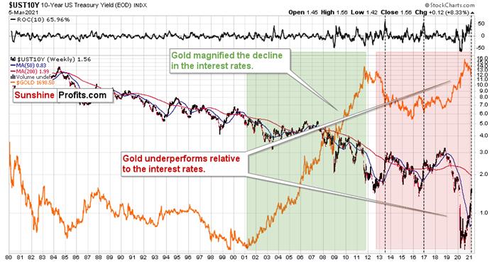 Also, based on the pace at which the rates have rallied recently, they might be topping here, but… There was no decline in the previous 40 years that was as big as what we saw between 2018 and 2020. Consequently, the corrective upswing might be bigger as well. Also, the above chart is not necessarily the scale that is big enough to make very long-term conclusions.