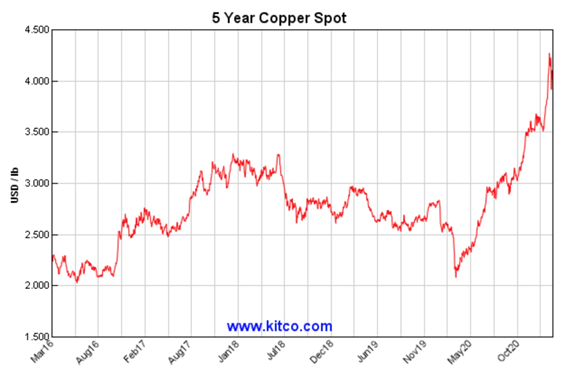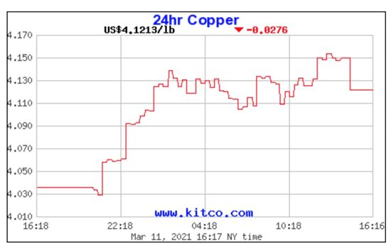 On Feb. 22 copper futures hit $4.12/lb, nearly double the March 2020 low, and approaching an all-time high set in 2011. Copper for May delivery closed at $4.14/pound on Thursday at the Comex in New York.