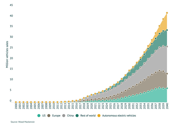 Electric vehicle sales, 2000-2040. Source: Wood Mackenzie