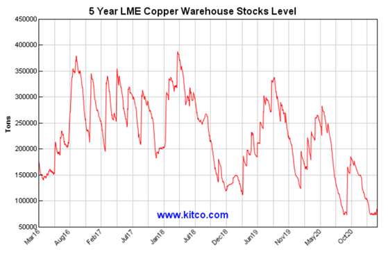 Frenzied copper buying is reflected in plummeting inventories, as the 5-year LME copper warehouse stocks level chart shows.