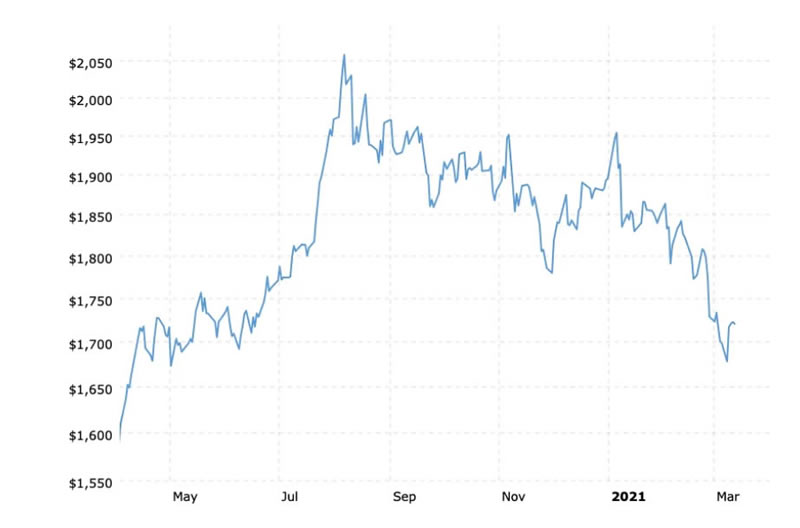 Over the past seven months, from its peak price in August 2020 at $2070, gold has dropped four hundred dollars per ounce back to $1683, its closing price last Monday on March 8th.