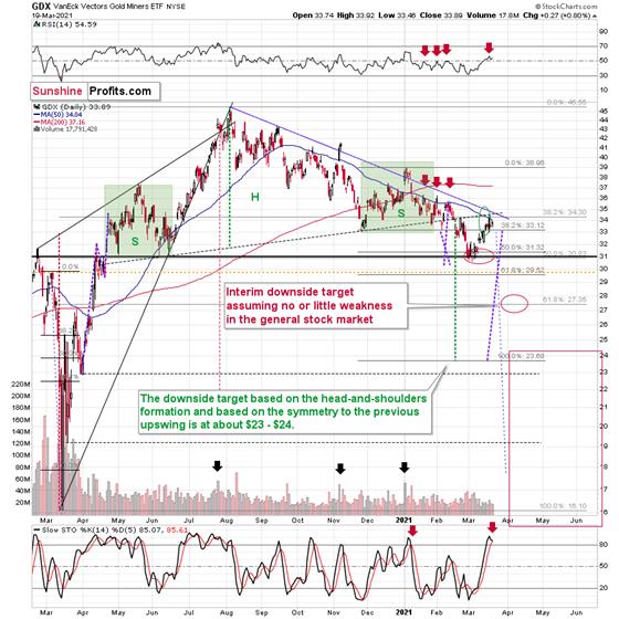 If you analyze the chart below, you can see that the GDX ETF moved to the upper level of my initial target range. However, with the Mar. 19 close eliciting a sell signal from the stochastic oscillator (the black and red lines at the bottom section of the chart), a historical reenactment (repeat of the early-2021 performance) could deliver another sharp move lower.