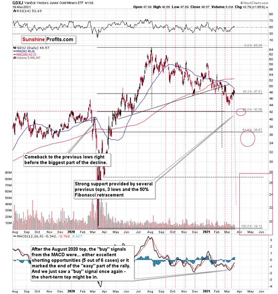 More importantly though, the MACD indicator is far from a light switch. While false buy signals often precede material drawdowns, the reversals don’t occur overnight. As a result, it’s perfectly normal for the GDXJ ETF to trade sideways or slightly higher for a few days before moving lower. This is what we saw last week