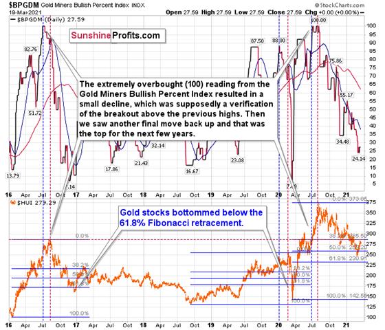 Another reason (in addition to the myriads of signals coming not only from mining stocks, but from gold, silver, USD Index, stocks, their ratios, and many fundamental observations) is the situation in the Gold Miners Bullish Percent Index ($BPGDM), which is not yet at the levels that triggered a major reversal in the past. The Index is now back above 27. However, far from a medium-term bottom, the latest reading is still more than 17 points above the 2016 and 2020 lows.