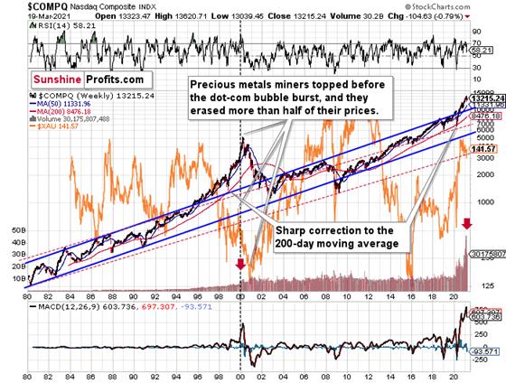Moreover, let’s keep in mind that an unwinding of NASDAQ speculation could deliver a fierce blow to the gold miners. Back in 2000, when the dot-com bubble burst, the NASDAQ lost nearly 80% of its value, while gold miners lost more than 50% of their value.