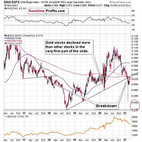 Moreover, please note that the HUI to S&P 500 ratio broke below the neck level (red, dashed line) of a broad head-and-shoulders pattern and it verified this breakdown by moving temporarily back to it. The target for the ratio based on this formation is at about 0.05 (slightly above it). Consequently, if the S&P 500 doesn’t decline at all (it just closed the week at 3913.10), the ratio at 0.05 would imply the HUI Index at about 196. However, if the S&P 500 declined to about 3,200 or so (its late-2020 lows) and the ratio moved to about 0.05, it would imply the HUI Index at about 160 – very close to its 2020 lows.