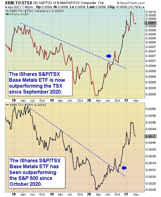 At the stock markets' current phase, the industrial metals sector is outperforming both the TSX and the S&P 500. The breakout in relative performance developed in September on the Canadian index and October on the U.S. index (Chart 2).