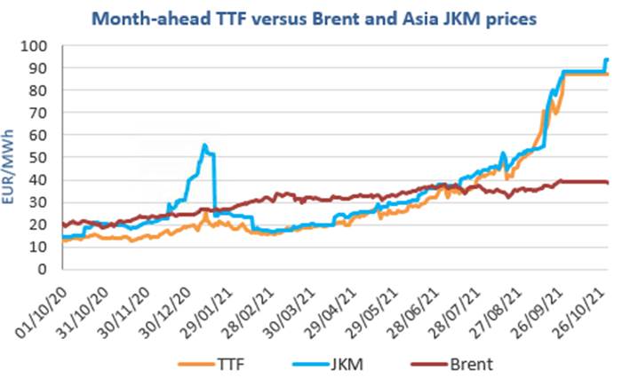 The sudden spike in Asia JKM November 2021 prices could be explained by the fact that European buyers are forced to keep competing aggressively with their Asian counterparts to attract LNG cargoes (Liquefied Natural Gas Transportation).