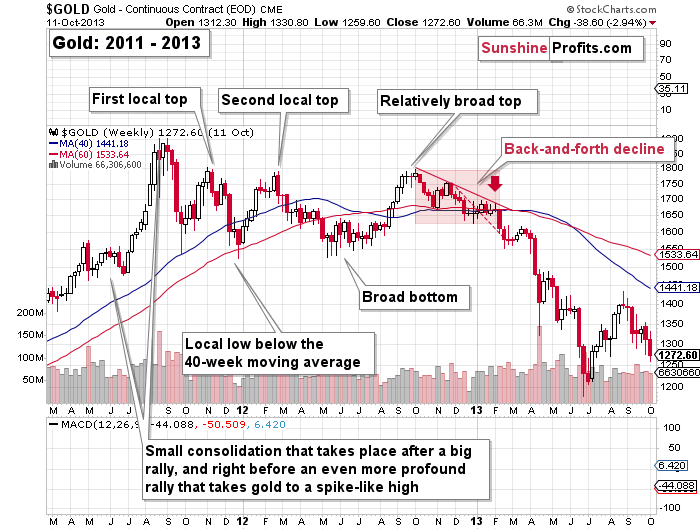Gold jumped to its 40-week moving average and to the declining red line based on the previous short-term highs. Let’s check the context – what happened in 2013?