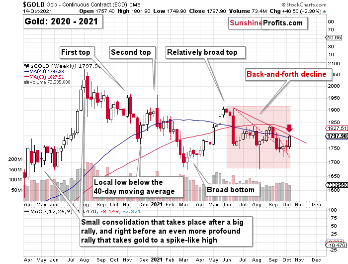 Right before moving to its previous medium-term lows, gold moved to its declining red resistance line that was also very close to its 40-week moving average. I marked this situation with a red arrow on both charts.