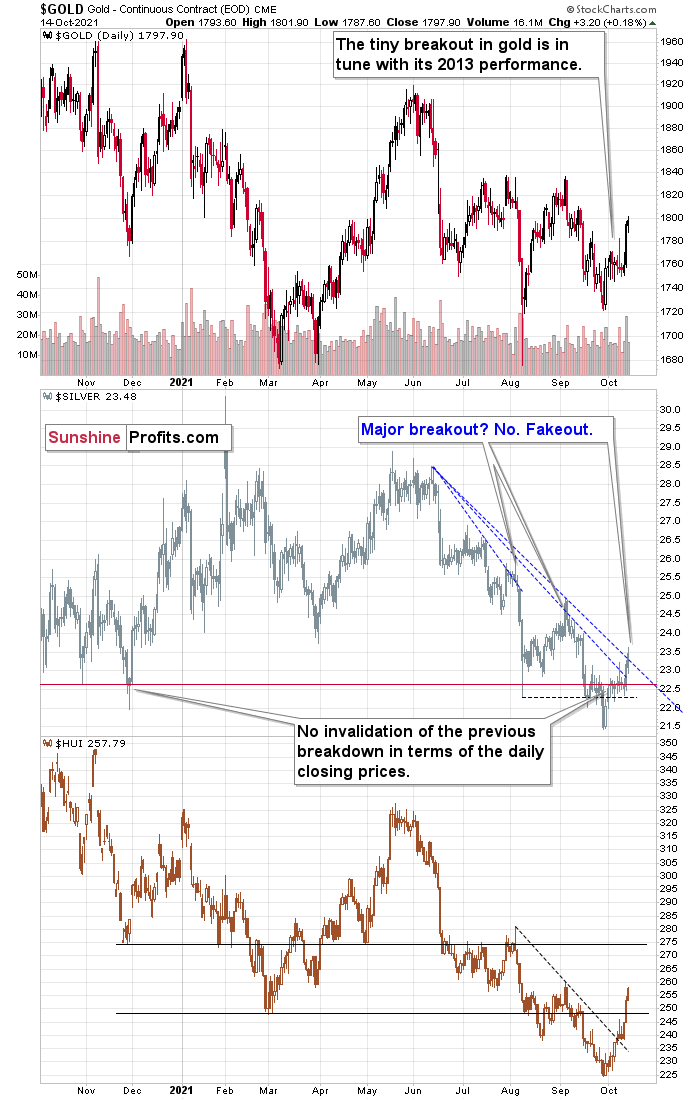 As far as silver’s “breakout” is concerned, it’s nothing bullish either. When you look at the August top, you’ll see that it also happened after a small, short-term breakout. The same with the early-September high. We’re seeing the same thing once again, and the implications are, once again, bearish.