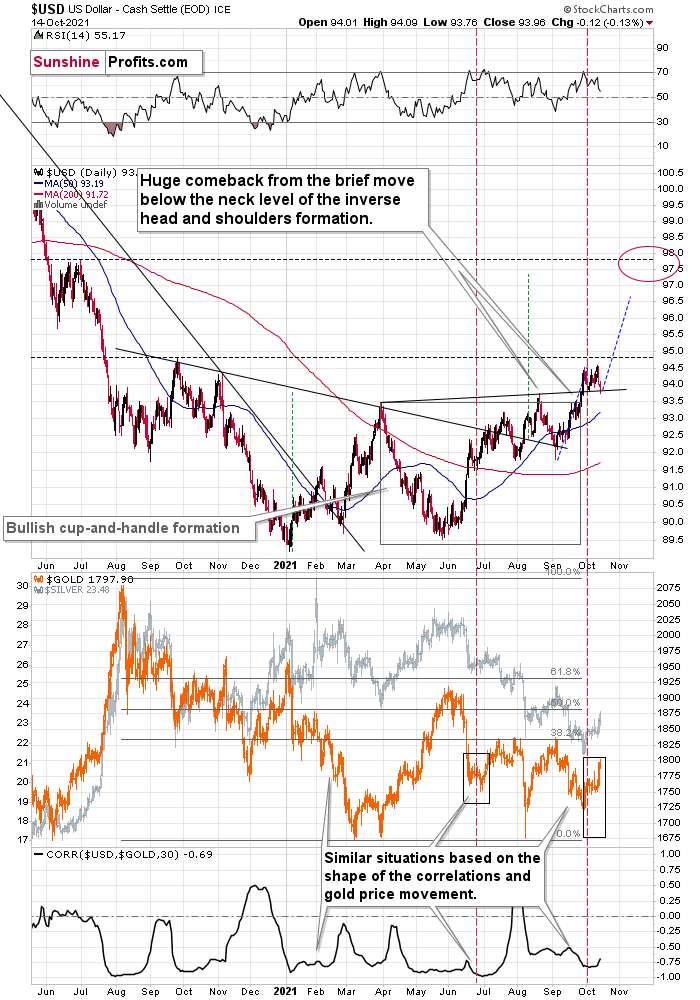 But why shouldn’t gold, silver, and mining stocks rally even higher before turning south? Not only are they overbought on their own, but they actually have a good reason to reverse, which is coming from the USD Index.