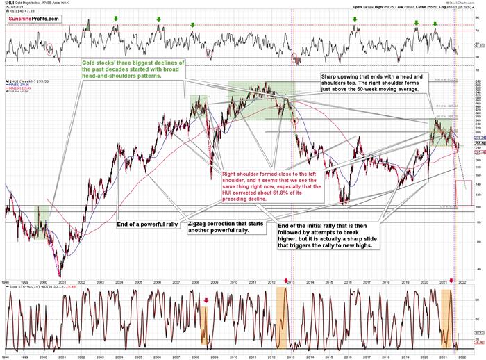 Furthermore, I warned previously that the miners’ drastic underperformance of gold was an extremely bearish sign. There were several weeks when gold rallied visibly, and the HUI Index actually declined modestly. And now, gold stocks are trading close to their previous 2021 lows, while gold is almost right in the middle between its yearly high and its yearly low.