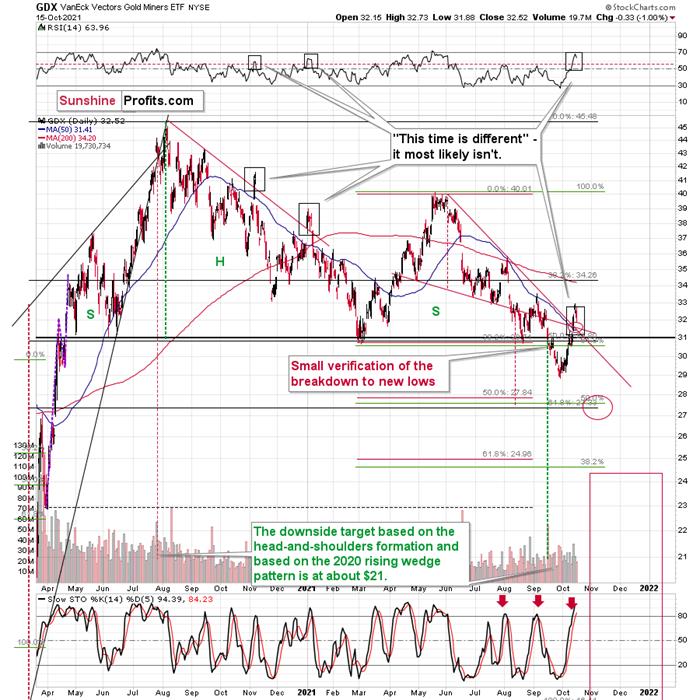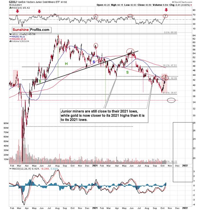 That was in late February 2020. Back then, juniors were after a short-term rally from below $40, and they topped above $44. The RSI approached 70 — just like what we see today. And then the GDXJ declined below $20 in less than a month. I think the decline will take place longer this time, but the outlook is still extremely bearish.