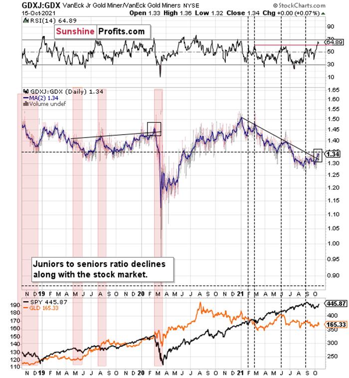 If the ratio is likely to continue its decline, then on a short-term basis we can expect it to decline to 1.27 or so. If the general stock market plunges, the ratio could move even lower, but let’s assume that stocks decline moderately (just as they did in the last couple of days) or that they do nothing or rally slightly. They’ve done all the above recently, so it’s natural to expect that this will be the case. Consequently, the trend in the GDXJ to GDX ratio would also be likely to continue, and thus expecting a move to about 1.26 - 1.27 seems rational.