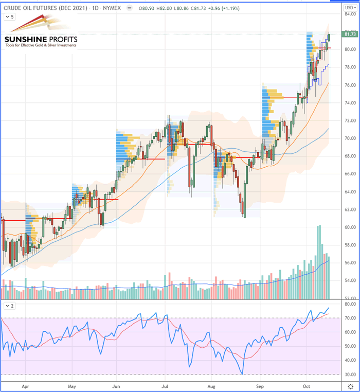 The new front month contract (as we switched now to Dec’21) for WTI Crude Oil futures closed the week at $82 per barrel on Friday (Oct. 15th).