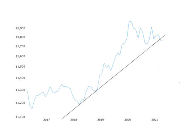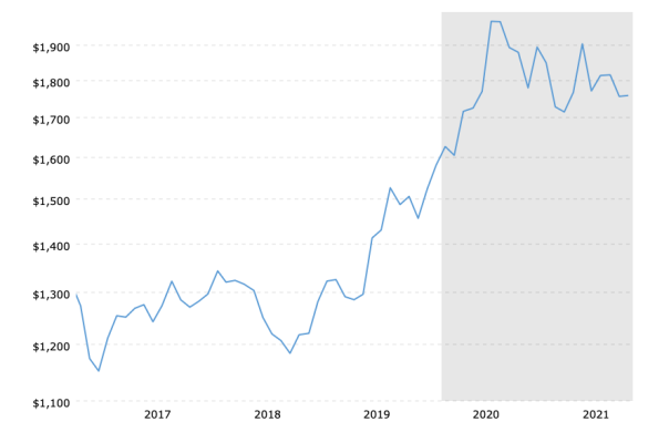 Below is another chart. This one shows average gold prices monthly over the past five years…