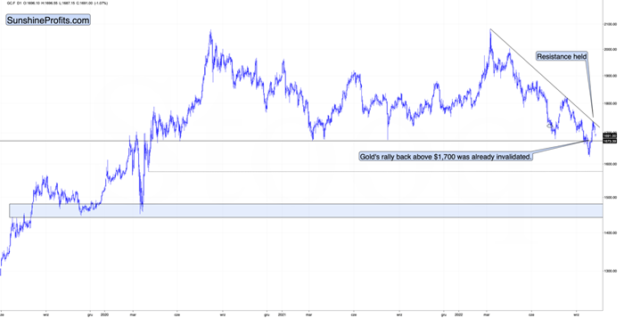 Gold declined after touching its declining, medium-term resistance line, and at the moment of writing these words it’s trading at about $1,690 – visibly below the important $1,700 level.