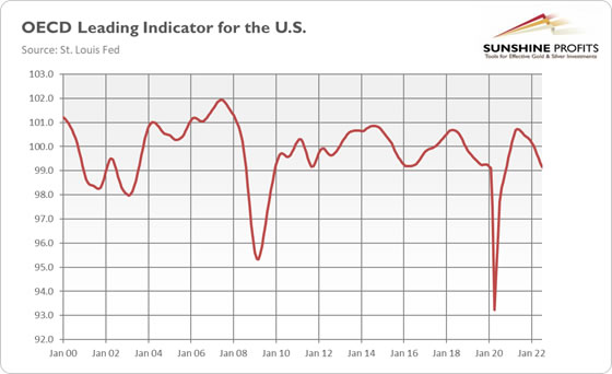 Indeed, the OECD’s leading indicator of U.S. economic activity has been on a decline for months, as the chart below shows, while the latest PMI data shows a steep fall in output across the US service sector and the fastest fall in activity since May 2020.