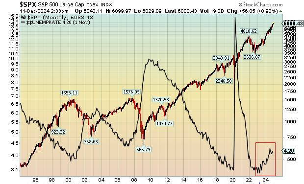 Over the past 30 years, the benchmark equity index has had an opposite correlation to the U.S. Unemployment Rate. The number of unemployed individuals began to increase in mid-2023 and as steadily risen to its present 4.20%. Currently, the S&P 500 has not reacted as in past advances of unemployment.