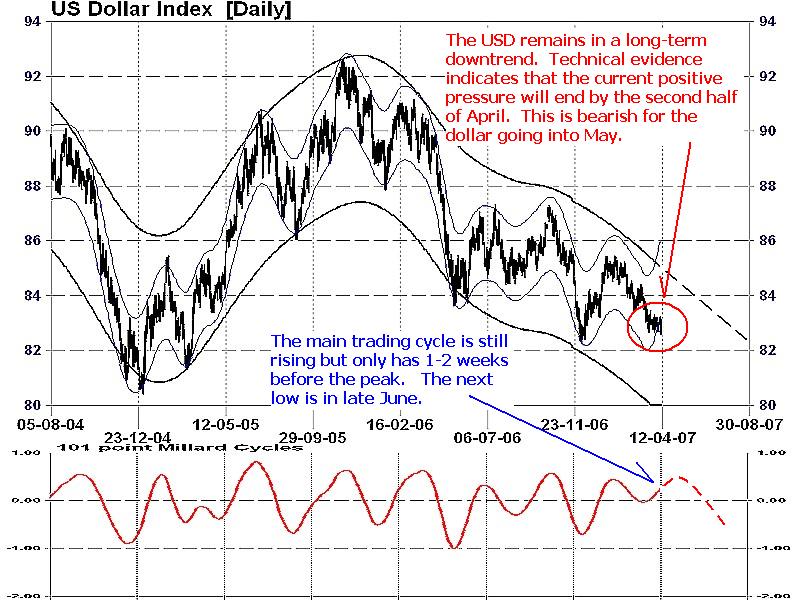 From the correction low in early October 2006, gold has shown increasing technical strength as each new 13-week trading cycle unfolds and lifts the metal higher. This sequence of improving prices gives a good indication of expanding strength and also helps forecast the movement of this precious metal over the next few months. With a new 13-week trading cycle developing in the first half of April (see the lower portion of Chart 1), a price peak can be anticipated mid-point (second half of May) at a level of near $720. The next trough should form in late June.