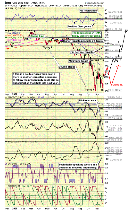 As promised Friday, here we are with a look at the Amex Gold Bugs Index (HUI) in an effort to gauge the likely strength of the anticipated impulse into the first quarter of next year. And as you will see below this move could get quite impulsive if Bollinger Band (BB) widths begin to expand during the move. Certainly such thinking would not be a stretch considering Friday's 45 point move higher in the HUI, however we are not making any assumptions in this regard as option expiries often cause violet moves if prices are either too far above or below equilibrium thresholds. So you see the true test of how strong the present impulse will be is likely better judged by what happens this week, along with other considerations which will be dealt with below.