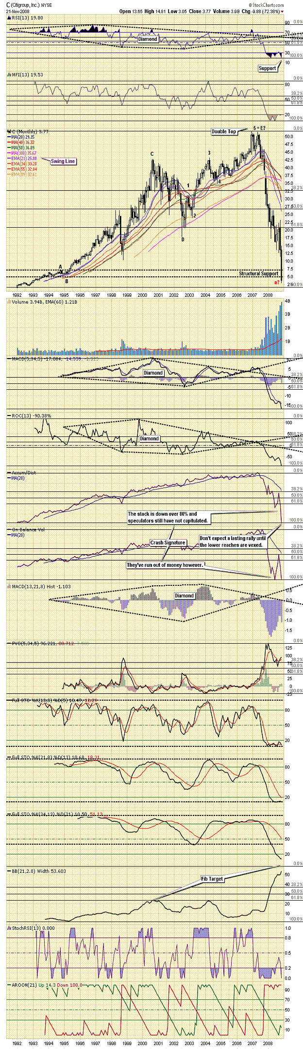 Do put / call ratios control that much / many markets? Answer: You bet they are. They are the center of the universe. They control the outcomes in the equity markets, which in turn control debt, currency, and commodity markets via intermarket relationships. Just look what the permanently bullish players in Citigroup (C:NYSE) did to that stock, which was telegraphed by the ‘crash signature' in the trade, a topic that was broached here just last week , prior to its collapse. At the time it was stated not to expect a lasting rally until the lower reaches of the accumulation / distribution pattern was vexed, and sure enough over-zealous speculators brought the mighty C to its knees within the week. The great C would be gone right now due to its inability to raise financing , which again, is a function of it's share price / equity. (See Figure 2)