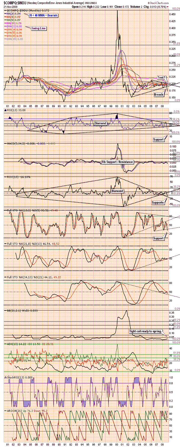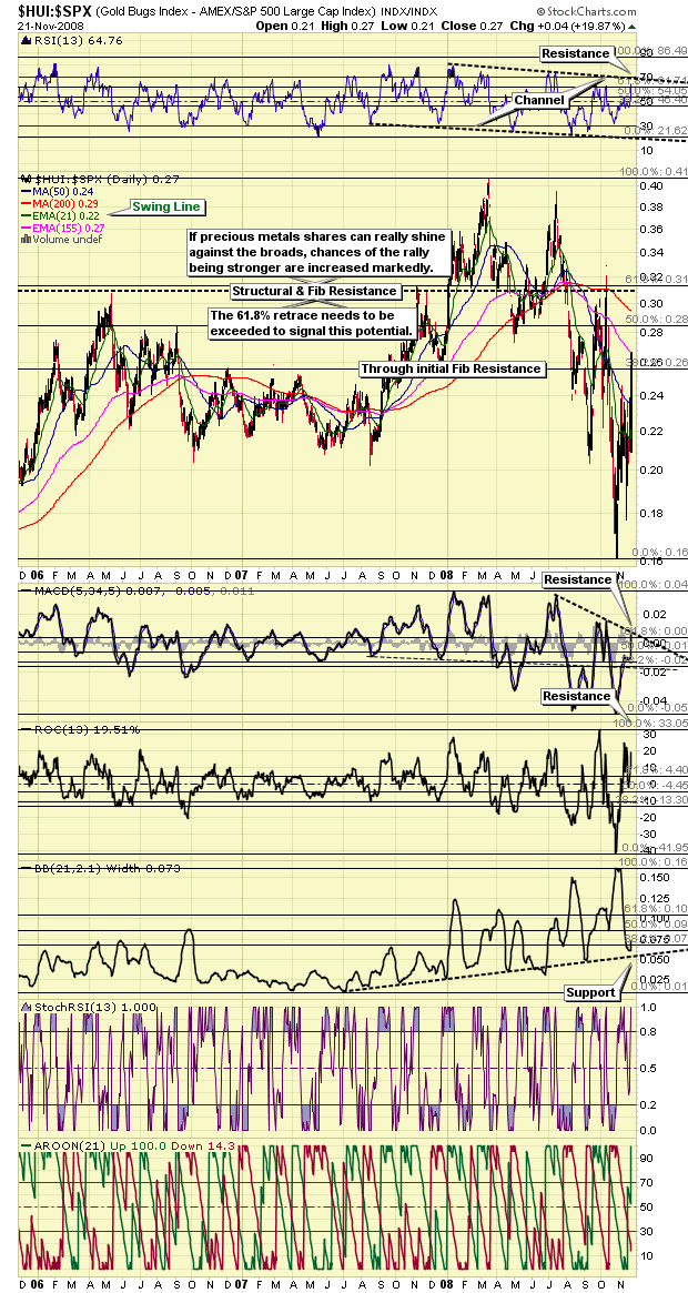 So if you can believe it, the speculators control the economy, which is a natural development in a mature fiat currency based system, this, and all the bailouts , which of course will not work . In the meantime however, the fact C has likely hit bottom, as can be deduced by observing the fact the ‘crash signature' in the trade has been removed, along with the traditional run-up into Thanks Giving Day weekend expected in the broads, facilitated by the lack of influence by open interest put / call ratios being this far away from expiry, gives rise to the observation no matter which scenario in Figure 1 prevails, more strength in the equity complex should be anticipated, with precious metals leading the way if this picture of the HUI / SPX Ratio is to be believed. (See Figure 3)