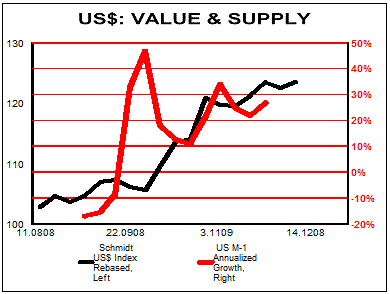 In the first chart is plotted the Schmidt U.S. $ Index, which does away the distortions in the popular dollar index. That index, the black line using the left axis, has been rebased to the beginning of August. Since early August, the US$'s value has risen by more than 20%, and that appreciation has hurt the value of $Gold. Red line is annualized rate of growth in U.S. money supply, M-1 SA, since first of August.